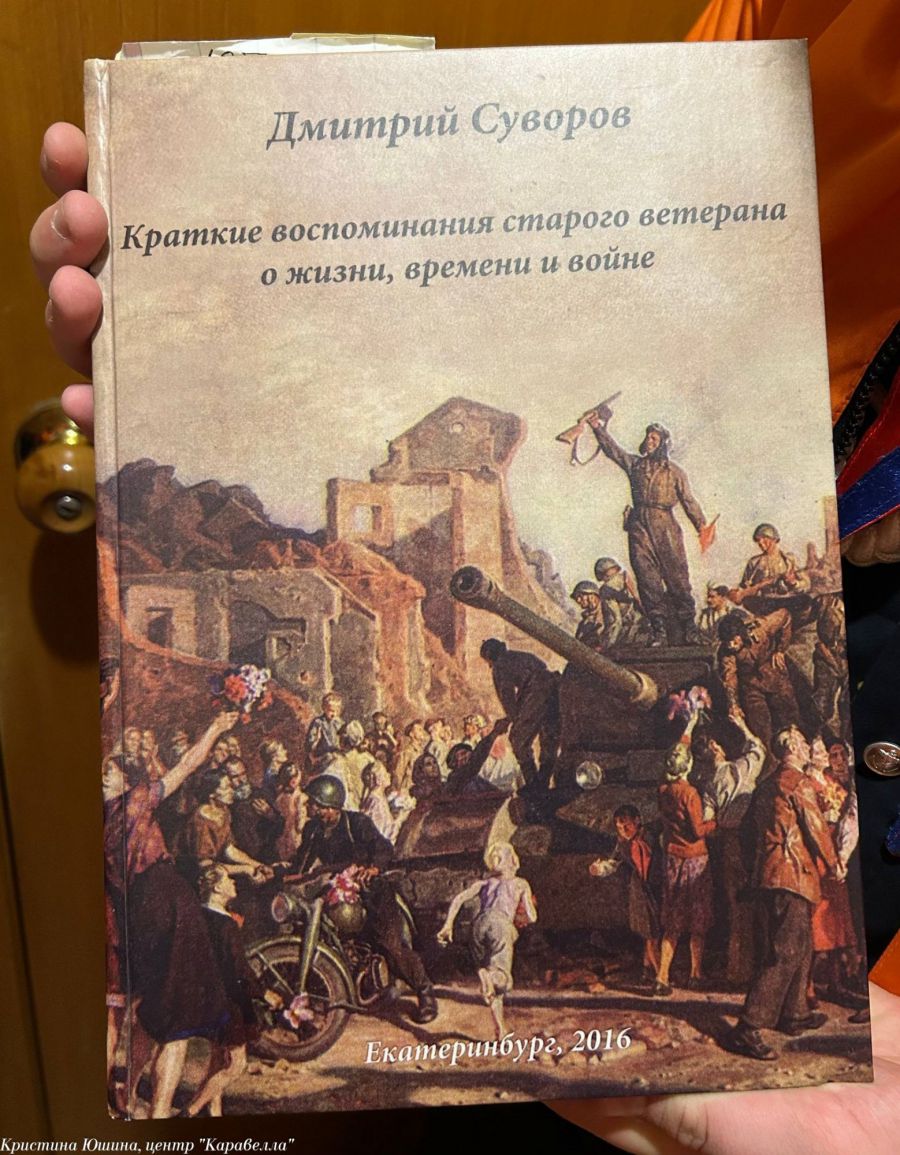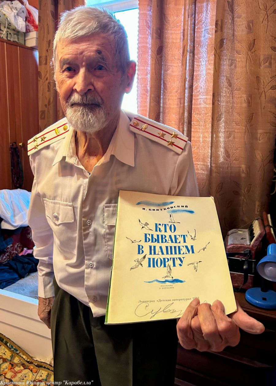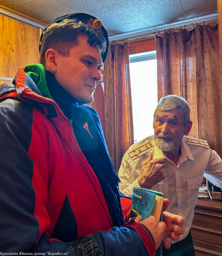 Дмитрий Николаевич очень рад был видеть нас, особенно – Петра Крапивина, с которым они давно знакомы и регулярно общаются. Мы поздравили Дмитрия Николаевича с наступающим Новым годом и подарили подарок. Общаться с такими людьми всегда очень и очень интересно. Дмитрий Николаевич рассказал, что выпустил уже две книги, которые сам написал и одну из них он нам даже подарил. А ещё - о том, что специально для нас надел сегодня тельняшку. Он очень интересный и веселый человек, который совсем не выглядит на свои 99 лет.