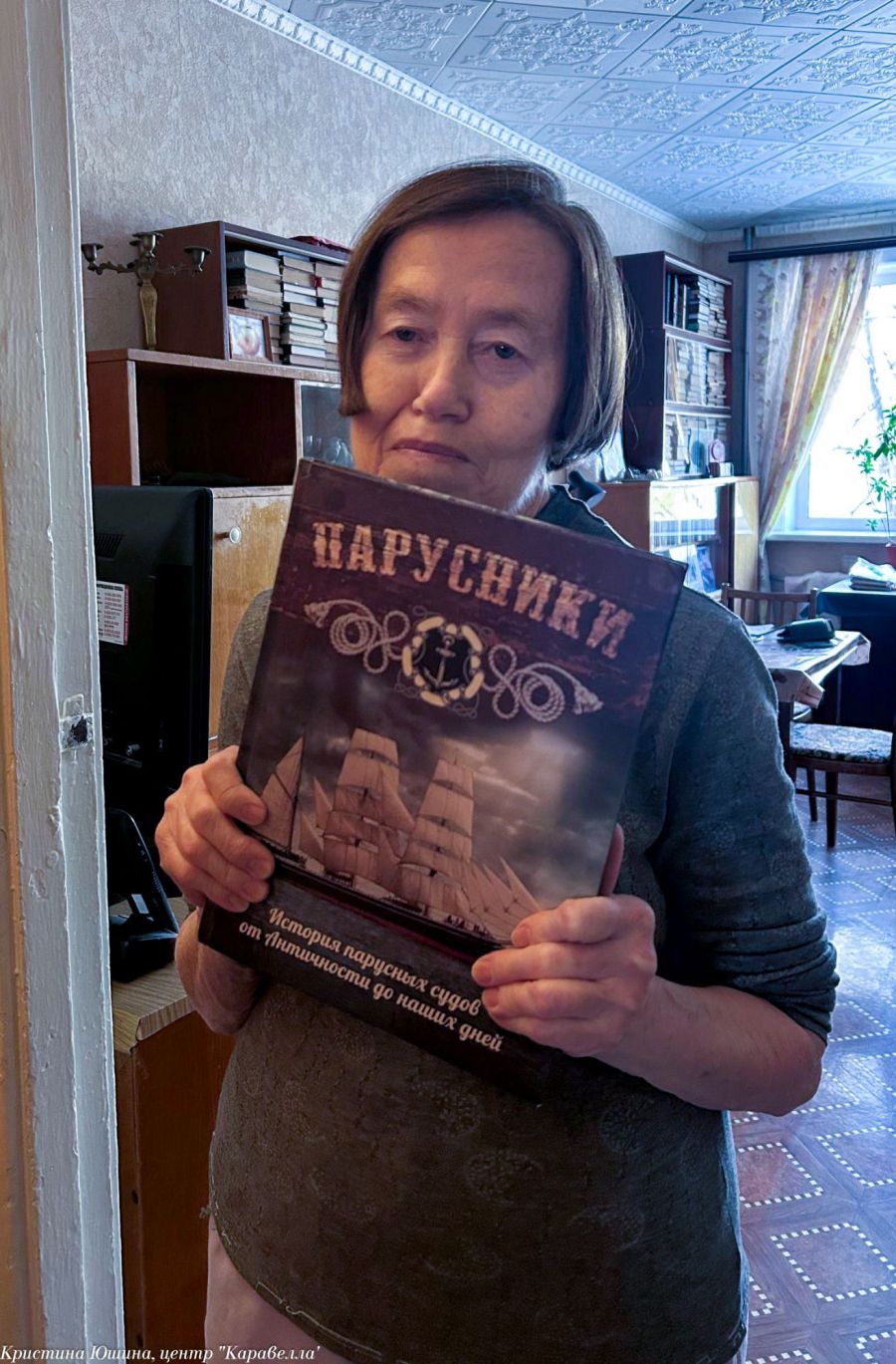 Последним адресатом у нас нашей группы была Галина Матвеевна Кесарева. В молодости она училась в горно-металлургическом техникуме, и получила специальности «химик-аналитик». Несколько лет назад она передала в наш Центр целую флотилию – макеты парусников, которые когда-то сделал её муж. Галина Матвеевна встретила нас с радостью. Мы ее поздравили с Наступающим 2026 годом и вручили подарок. Галина Матвеевна нашу дружную волонтёрскую команду тоже не оставила без подарков - и это снова была книга!