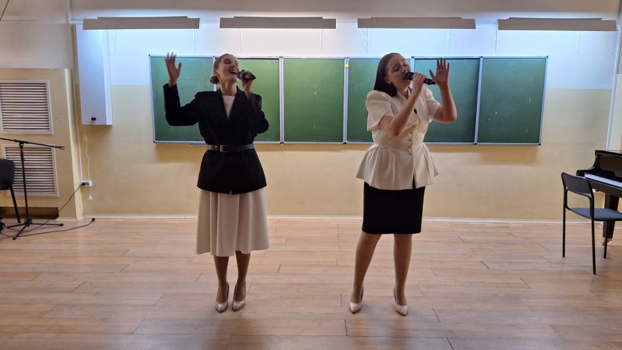Концертную программу продолжили студенты УрГПУ. Софья Спиридонова и Александра Сорокина, трогательно исполнили песню Дениса Майданова «Учитель».