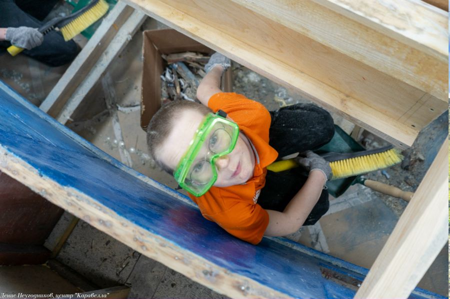 В данный момент идёт подгонка набора корпуса под постановку новых листов днища швертбота. Весь день разные бригады ребят с утра до вечера убирали остатки старого клея и зачищали шлифмашинками пространство под новую шпаклевку.