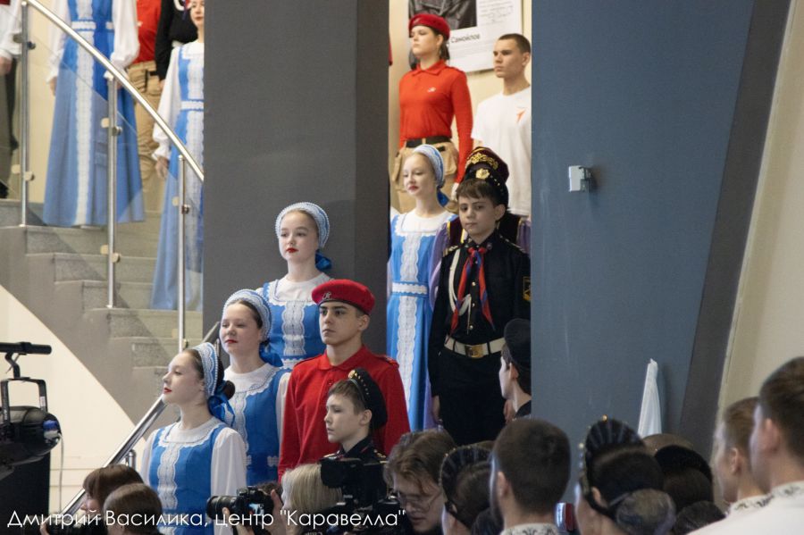 На следующий день в 9:20 все участники прибыли в мультимедийный парк, привели себя в порядок, получили флажки и отправились дожидаться начала события. Вот тут-то мы и оценили весь масштаб. Весь зал кишел пёстрыми цветами, костюмами, кокошниками и какими-то красивыми сарафанами. Часть ребят, кто был с нами на репетиции, прибыли в специальной униформе своих организаций, а другие пришли в костюмах коренных народов нашего края! Атмосферы мероприятию добавило и то, что проходит оно 21 февраля – в международный день родного языка, очень символично! Ожидание начала мероприятия нам помог скрасить маленький фуршет, организованный для ребят-участников на втором этаже Парка, так что время пролетело очень быстро и весело. Поразило, что началось всё ровно в 10.00 без задержек. И вот, мы уже спускаемся по лестнице на встречу почётным гостям.